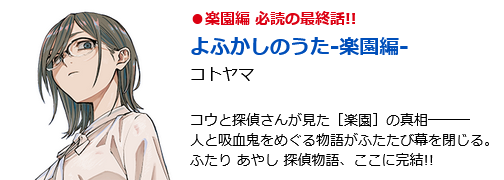 Yofukashi no Uta -Rakuen-hen- es la secuela de Call of the Night (Yofukashi no Uta), publicada en España por Ivrea, y se publica en la revista desde el 2 de julio.