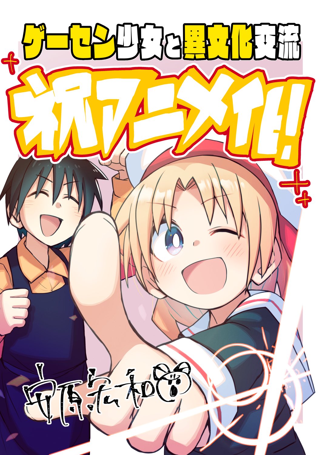 Hirokazu Yasuhara ha anunciado en Twitter que su manga Gēsen Shōjo to Ibunka Kōryū tendrá una adaptación anime, y ha dibujado esta ilustración celebrando el anuncio.